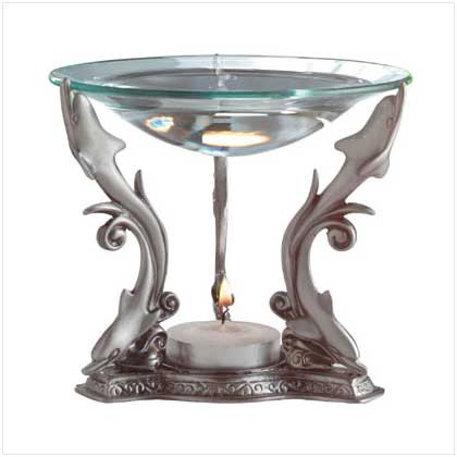 Lithe dolphins seem to flow to the rim of the oil dish, floating through the air as gracefully as they swim through the sea. Pewter and glass. Uses tealights (not included). 4" diameter x 4 1/8" high.