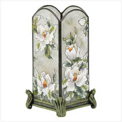 Pretty painted glass panels show Victorian magnolias in their lush splendor. Uses tealights (not included) Alabastrite base. 3 3/4" x 3 3/4" x 7 1/4" high.